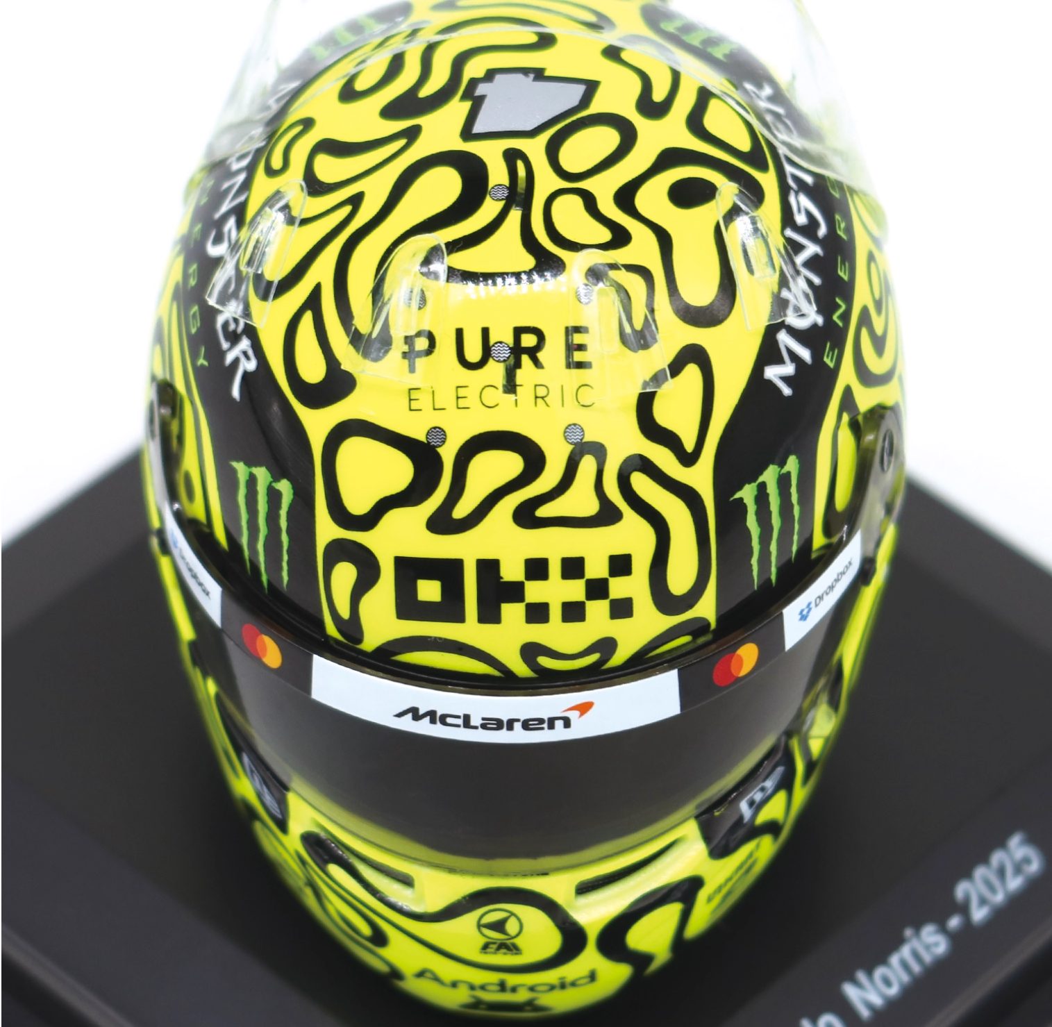 Celebrate the 2025 Formula 1 season with this striking 1:5 scale replica of Lando Norris’ McLaren helmet. Produced by Spark, the model showcases Norris’ bold and colourful design, complete with sponsor logos and intricate detailing that reflect his signature style on and off the track.