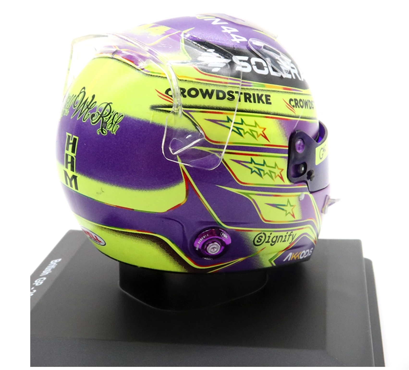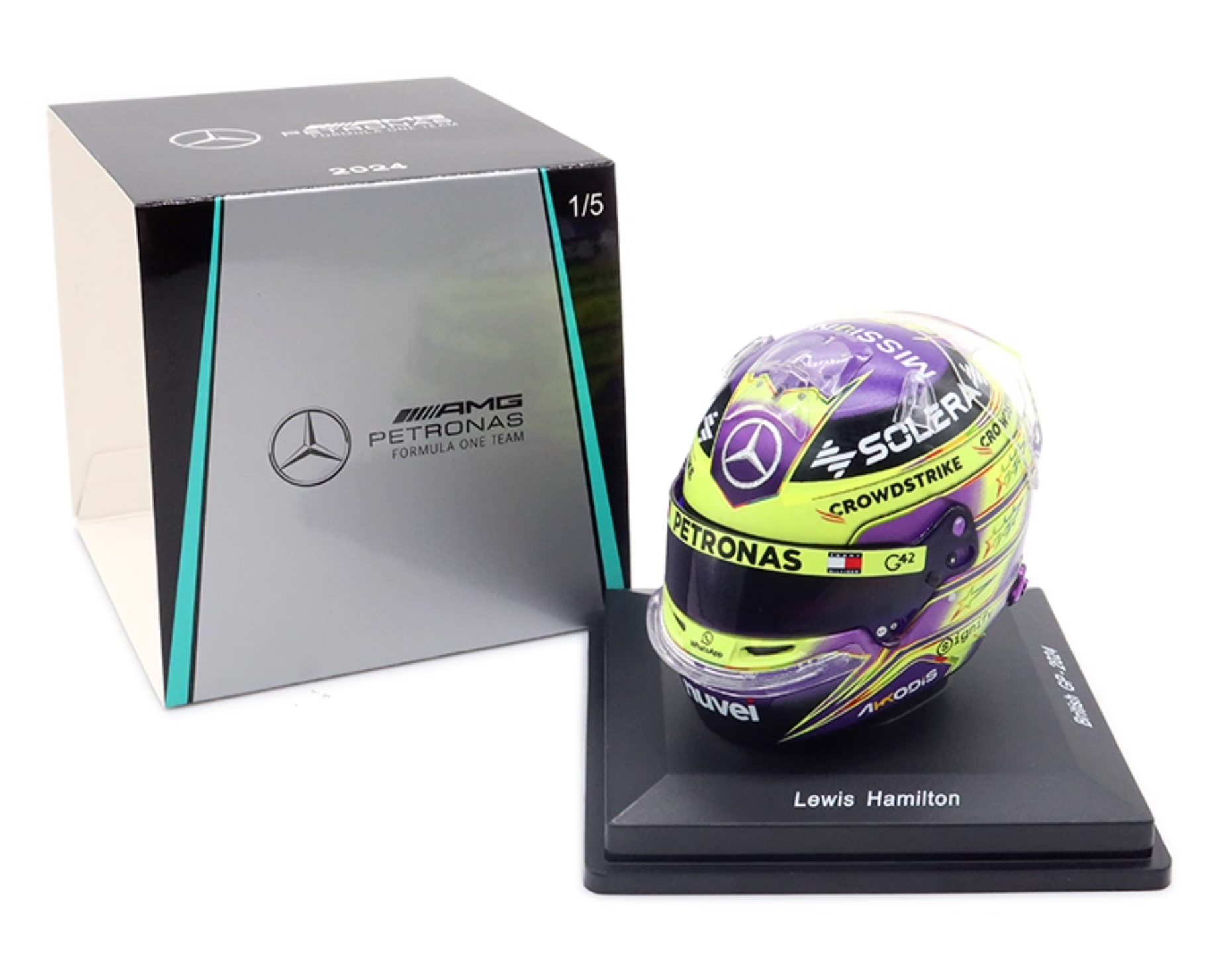 Each helmet is mounted on a display base and presented in a collector’s box, making it a standout addition for fans of Hamilton, Mercedes-AMG Petronas, and Formula 1 history. A true celebration of Hamilton’s legacy and his connection with Silverstone.