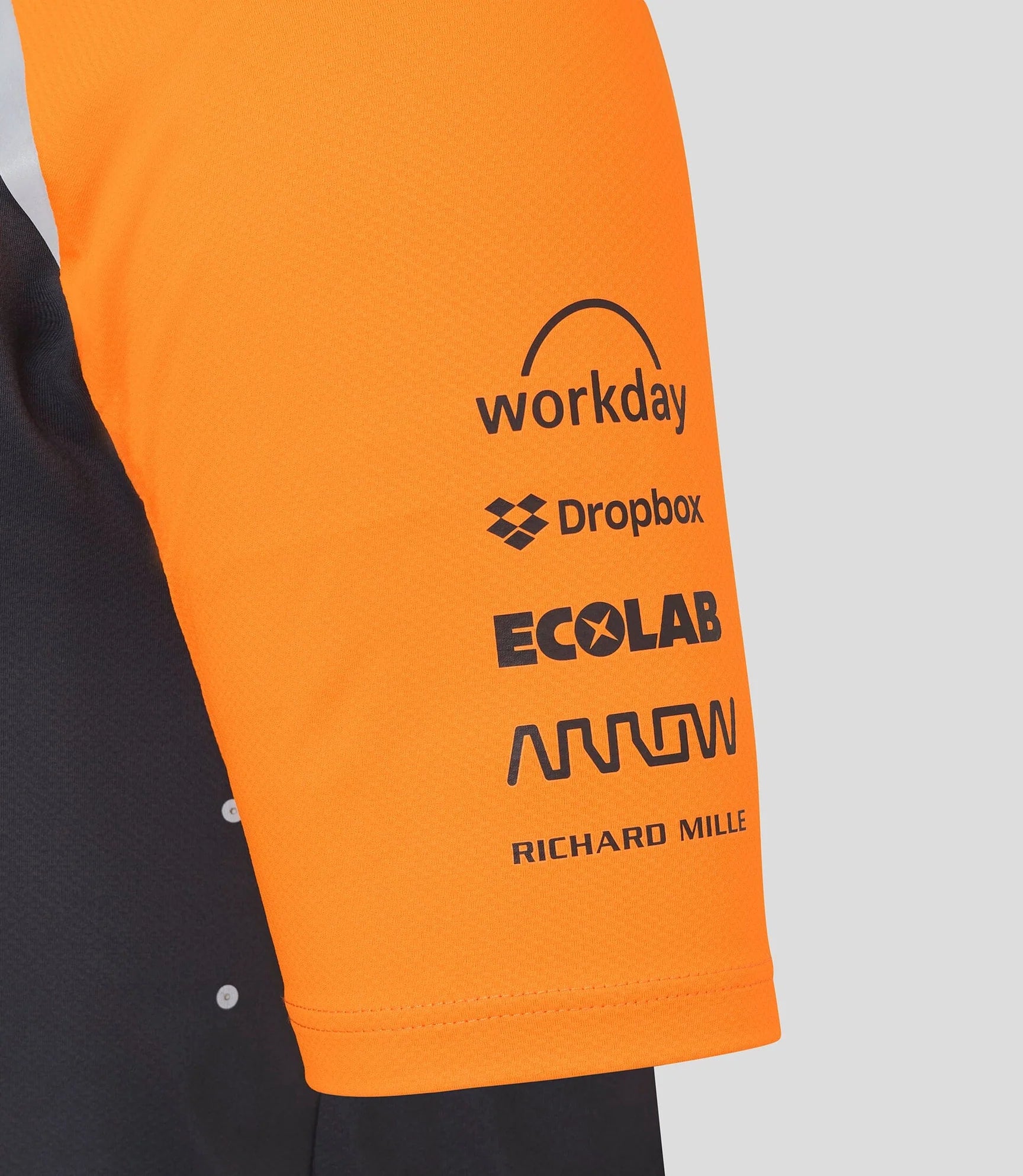 Show your passion for McLaren with the official 2025 Men’s Team T-Shirt in Phantom grey. Featuring the team’s signature papaya orange sleeves and detailed sponsor logos, this shirt mirrors the design worn by the drivers and crew during the season.